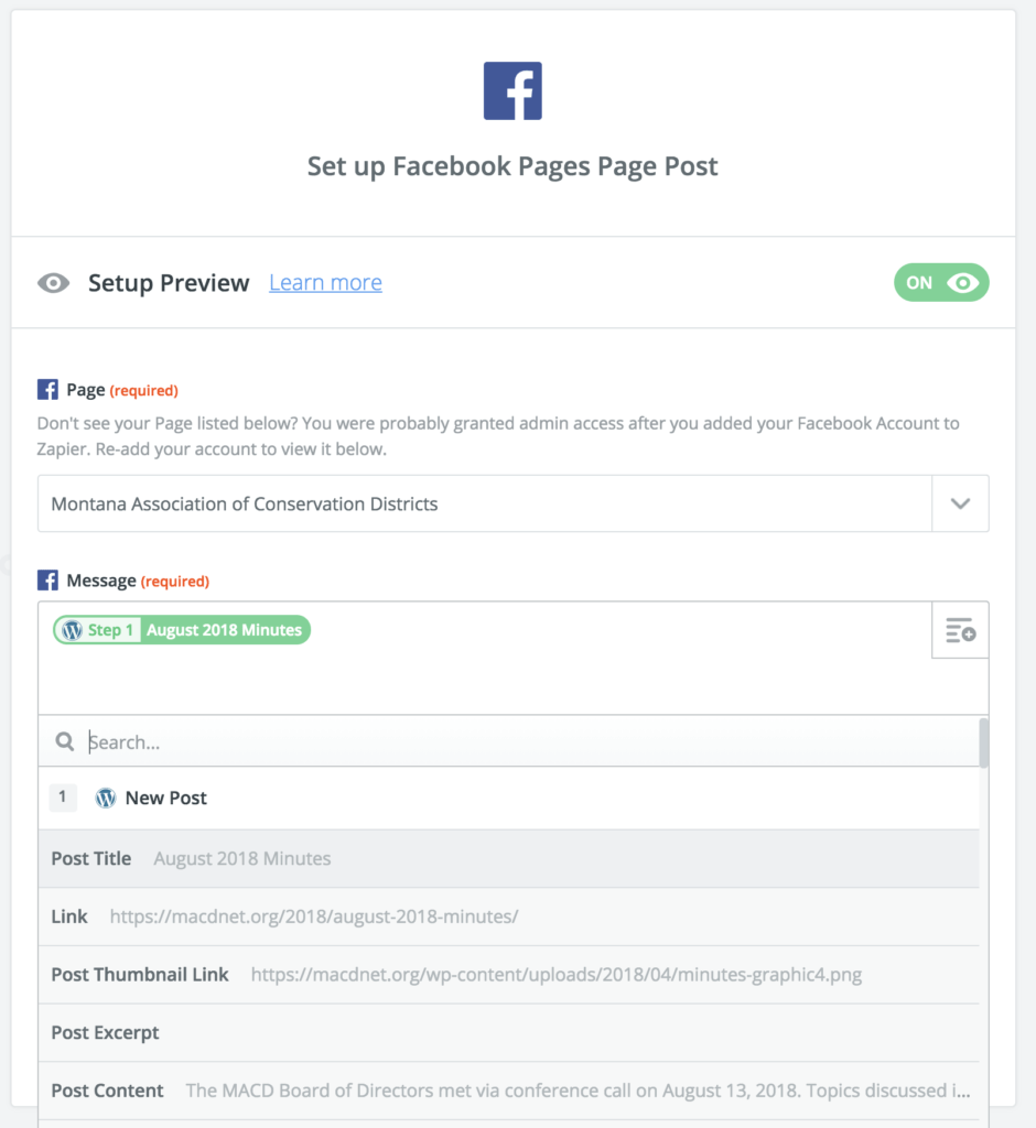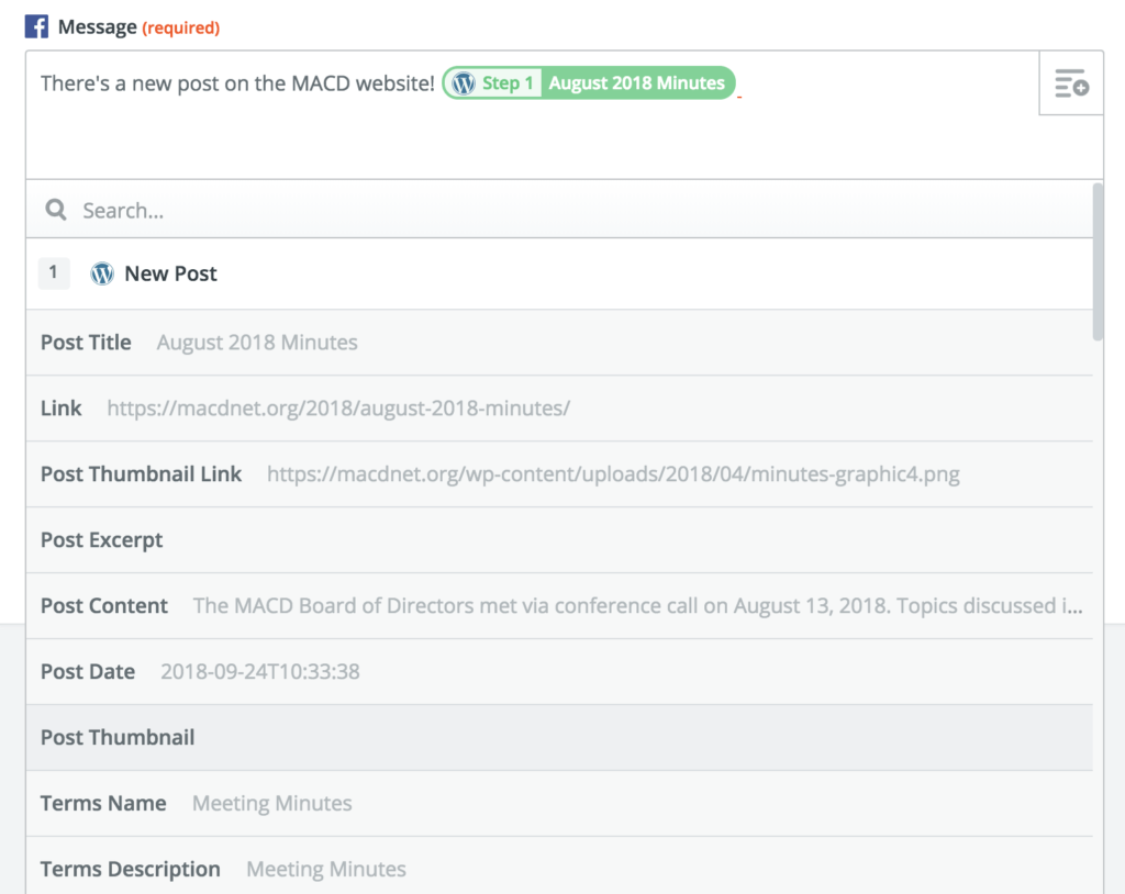 Then, I select the information that I want to be in the Facebook message. This is the text that goes in the post. For this example, I want the message to be the same as the title of my WordPress post. The sample that I have here is our most recent post, August 2018 Minutes. As you can see, there are a lot of options available to select, and I can put multiple data points in the message. I can also type in text.
